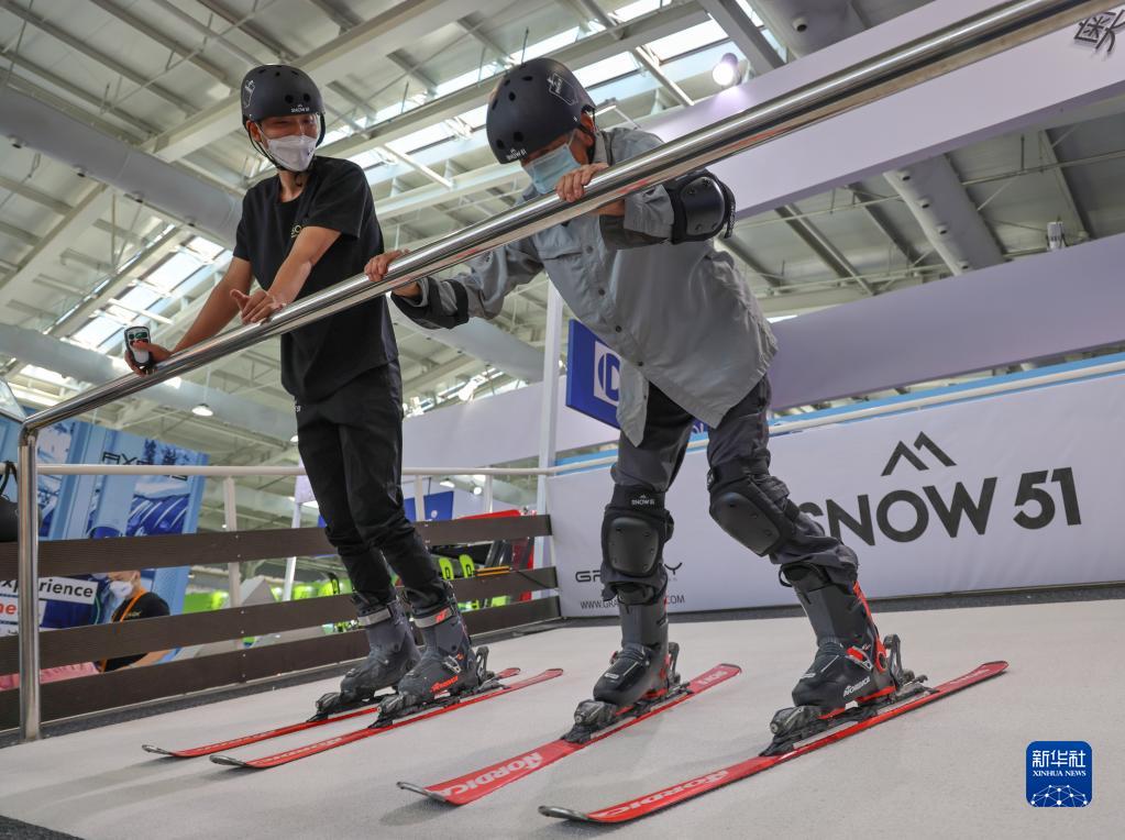 9月1日,一名男子在體育服務(wù)專(zhuān)題展區體驗滑雪模擬設備。