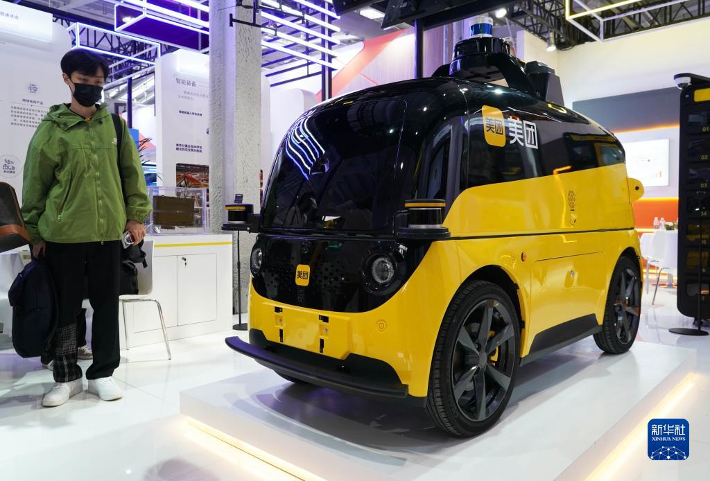 9月2日在供應鏈及商務(wù)服務(wù)專(zhuān)題展區拍攝的自動(dòng)配送車(chē)。