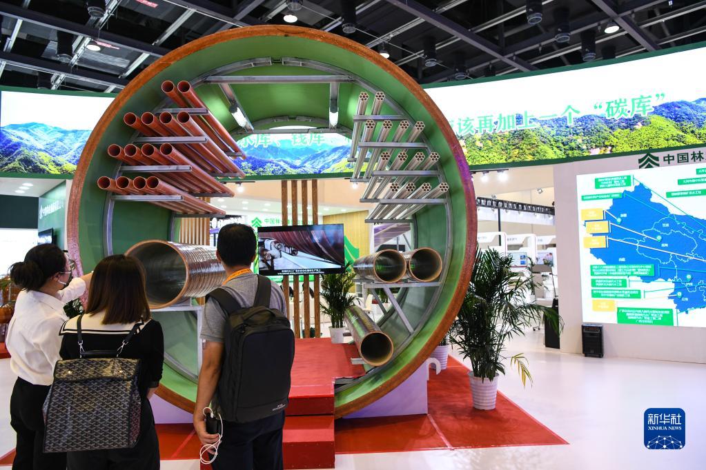 9月2日,在環(huán)境服務(wù)專(zhuān)題展區,觀(guān)眾參觀(guān)竹纏繞復合材料管廊。