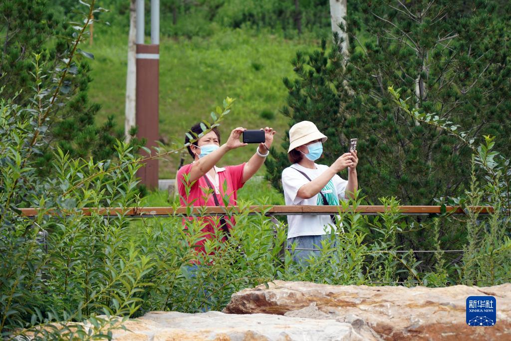 2022年7月19日,居民在河北邯鄲武安市九龍山礦山生態(tài)修復公園拍照游玩。