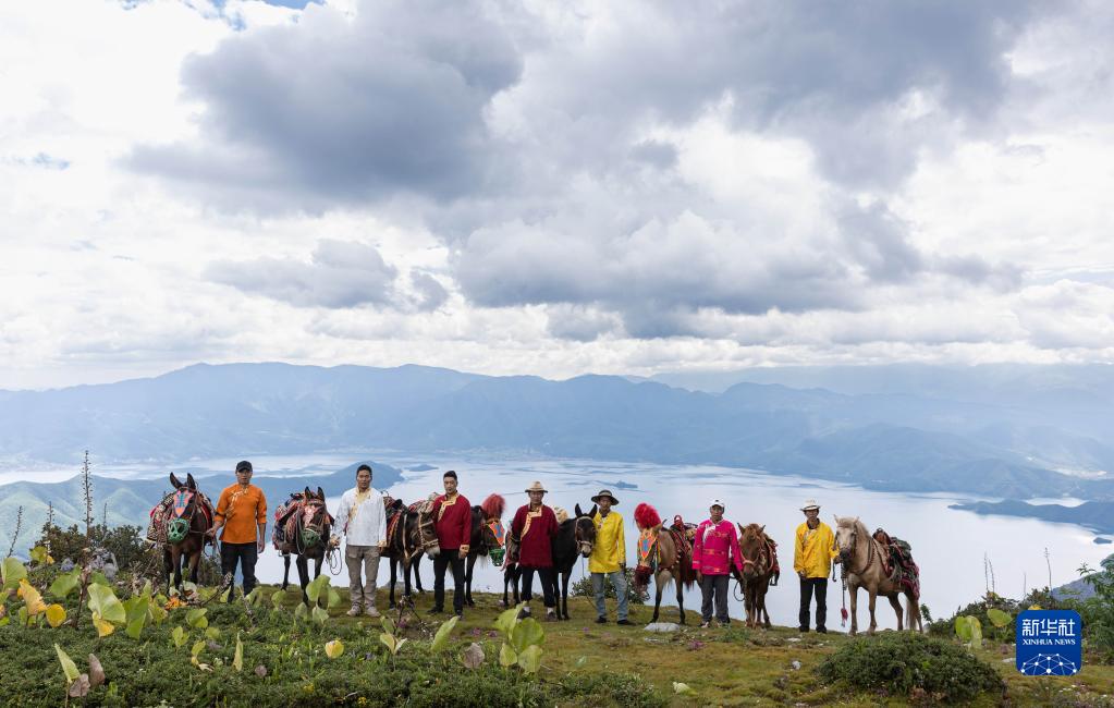 瀘沽湖馬幫隊隊員們在牛窩子山山頂觀(guān)景臺合影(9月1日攝)。