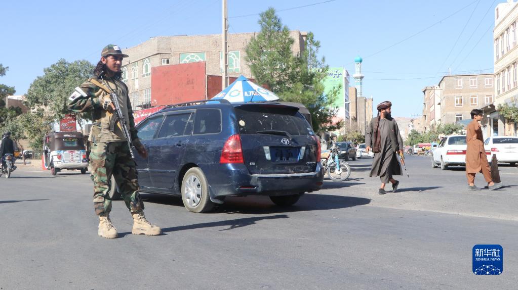 9月2日,在阿富汗赫拉特省發(fā)生爆炸的清真寺附近,安全人員設卡檢查。