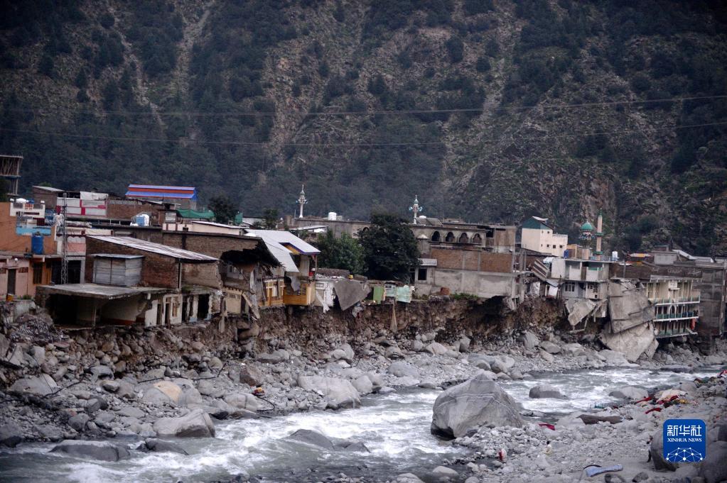 這是9月1日在巴基斯坦開(kāi)伯爾-普什圖省斯瓦特地區拍攝的被洪水損毀的房屋。