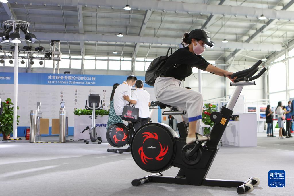 9月3日,觀(guān)眾在體育服務(wù)專(zhuān)題展區體驗健身器材。