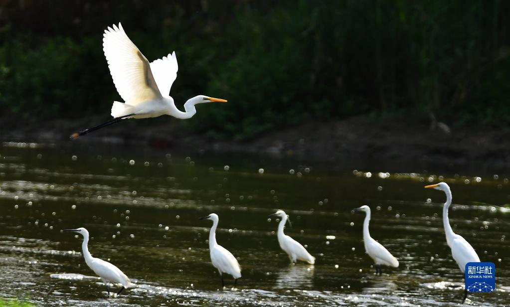 8月27日,白鷺在山東省滕州市的荊河上嬉戲。