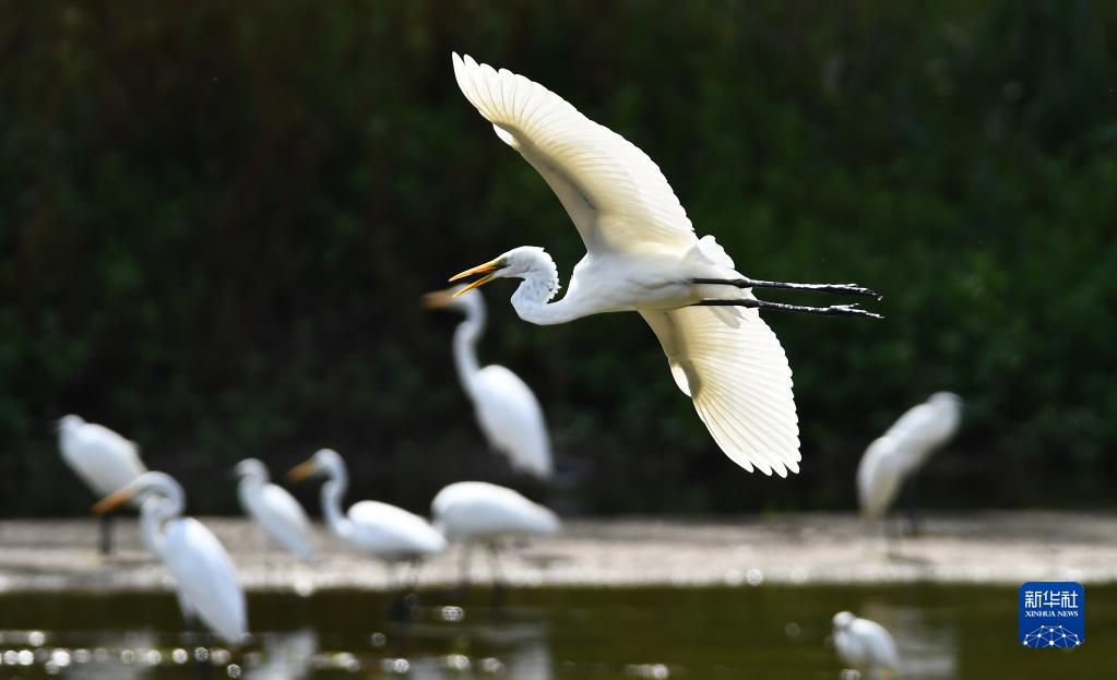 8月27日,白鷺在山東省滕州市境內的荊河水中飛舞。