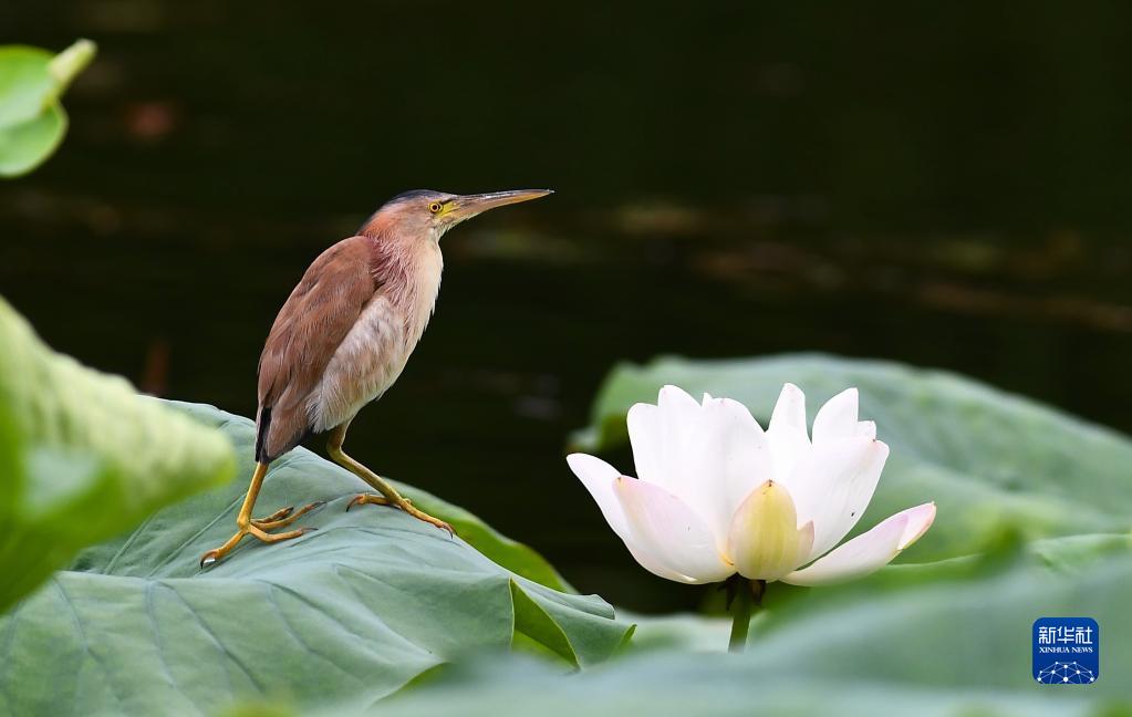 8月28日,在山東省滕州市荊河公園,一只水鳥(niǎo)停在荷花旁。