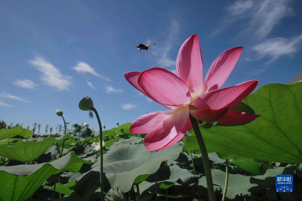 8月27日在河北省遵化市興旺寨鎮的一處荷花池拍攝的晴空下的荷花。