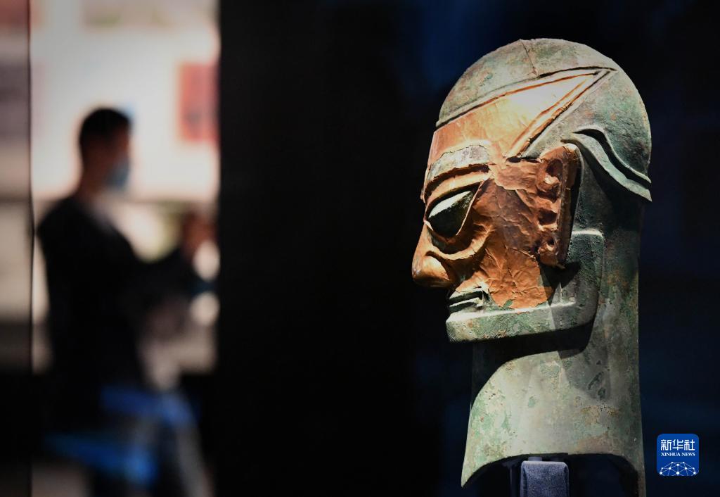 這是9月4日在“繁星盈天——中國百年百大考古發(fā)現展”上拍攝的“戴金面罩青銅人頭像”。