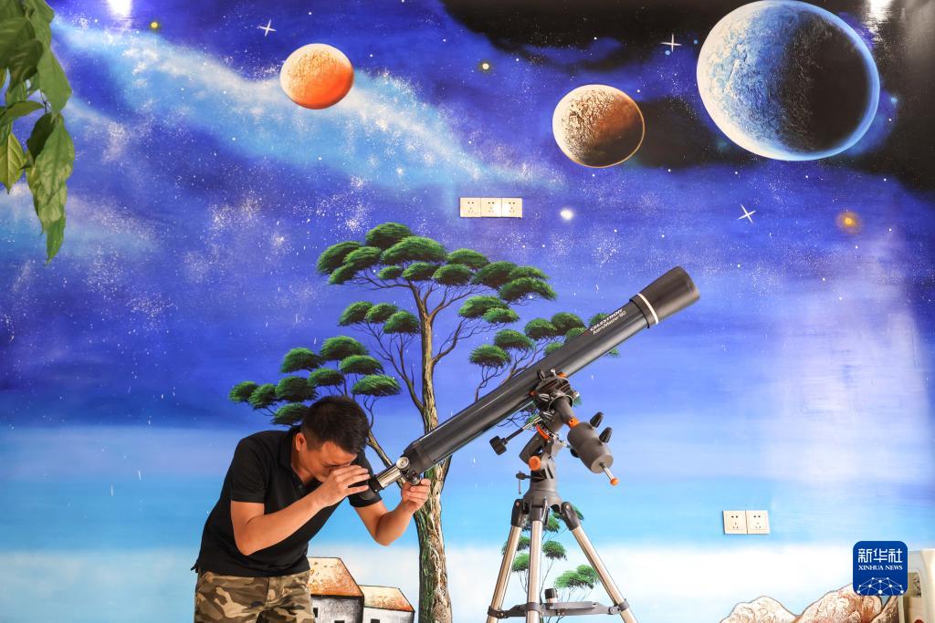 2022年7月19日,32歲的劉成亮在民宿內調試望遠鏡。2016年,劉成亮搬離天眼核心區遷至航龍村星際家園,并將安置房用于經(jīng)營(yíng)民宿。目前,劉成亮所經(jīng)營(yíng)的民宿有14個(gè)房間,在每年的旅游旺季,入住率能達到百分之八十以上。