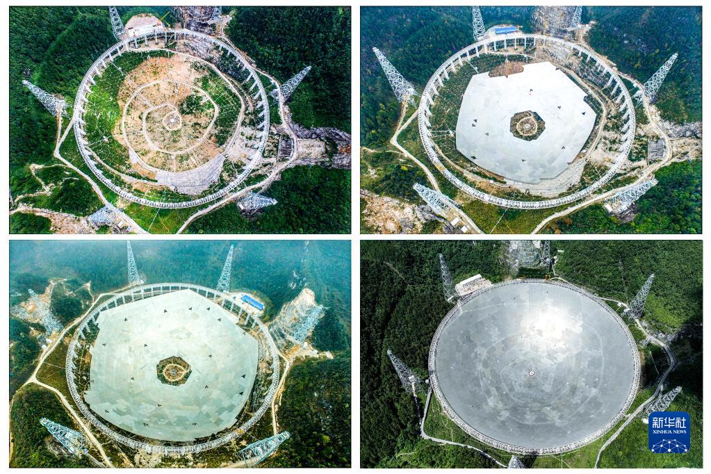 這是一張拼版照片:依次為“中國天眼”拼裝第一塊反射面板(左上,2015年8月2日攝)、“中國天眼”反射面板安裝近半(右上,2015年12月16日攝)、“中國天眼”反射面板安裝近八成(左下,2016年3月9日攝)、維護保養期間的“中國天眼”(右下,2022年7月21日攝)。