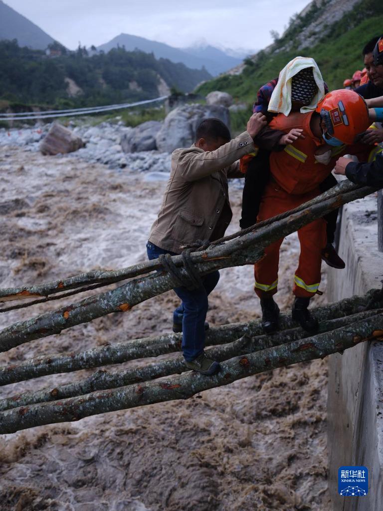9月5日,四川森林消防總隊甘孜支隊消防員在瀘定縣磨西鎮青崗坪村轉移群眾。