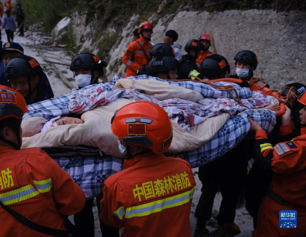 9月5日,四川森林消防總隊甘孜支隊消防員在瀘定縣磨西鎮青崗坪村轉移傷員。