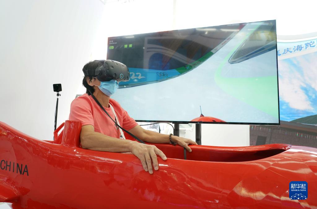 9月5日,在服貿會(huì )首鋼園區的文旅服務(wù)專(zhuān)題展區,觀(guān)眾通過(guò)VR設備體驗雪車(chē)。