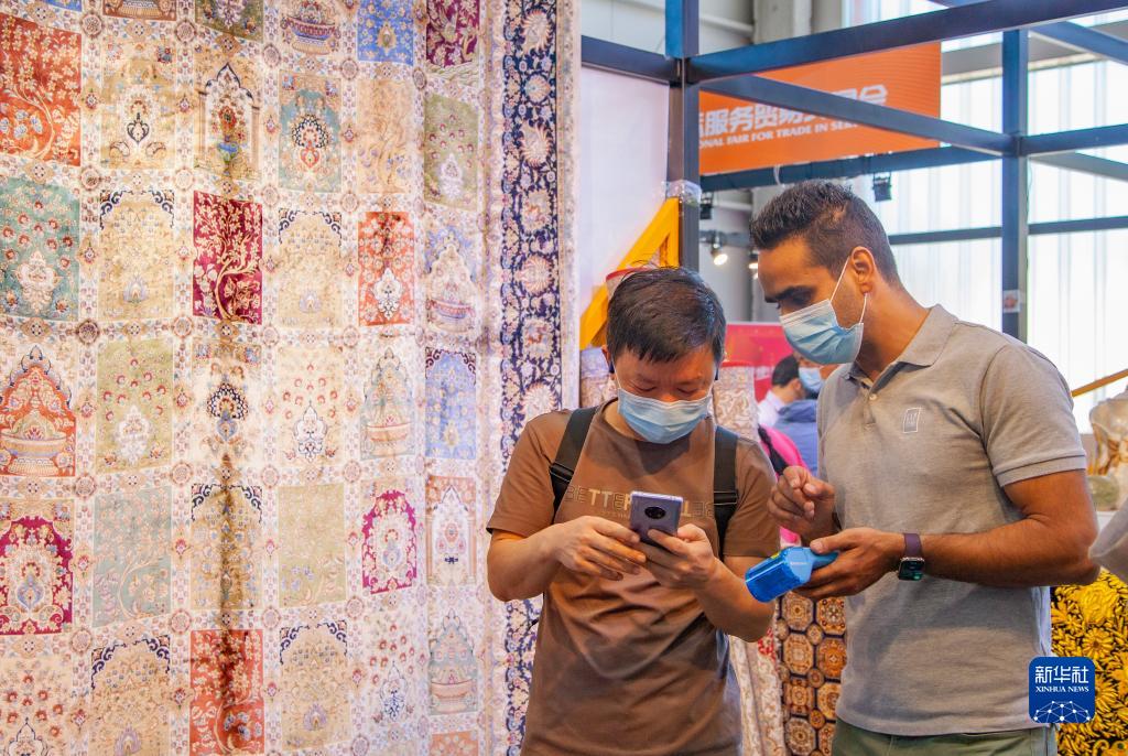 9月5日,觀(guān)眾(左)在服貿會(huì )首鋼園區的文旅服務(wù)專(zhuān)題展區巴基斯坦展臺購買(mǎi)商品。