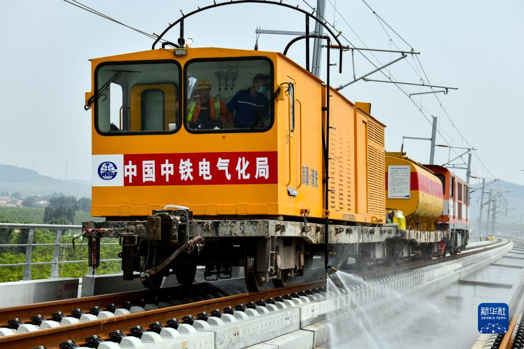 9月5日,在濟萊高鐵章丘段,隧道清洗車(chē)在清洗道床。