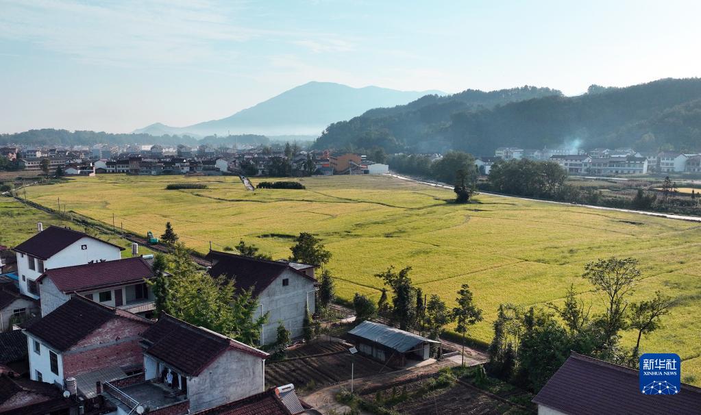 9月5日,漢中市南鄭區黃官鎮武營(yíng)村豐收稻田與村舍相映,構成一幅美景(無(wú)人機照片) 。
