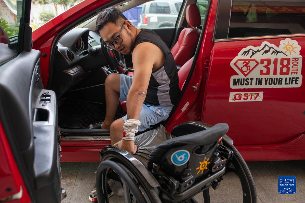 8月27日,到達成都“泉心健康之家生活重建訓練營(yíng)”后,何鵬安裝完輪椅并下車(chē)。