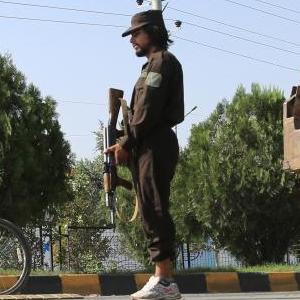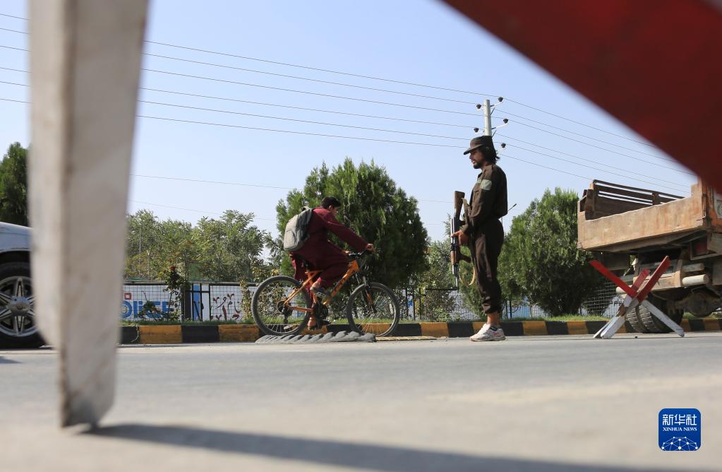 9月5日,阿富汗安全人員在喀布爾爆炸現場(chǎng)附近警戒。