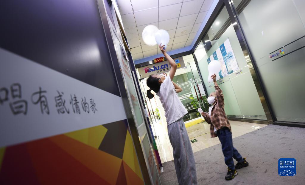 8月29日,在北京市海淀區,羊羊(化名,右)和淼淼(化名)在錄音教室外玩耍。