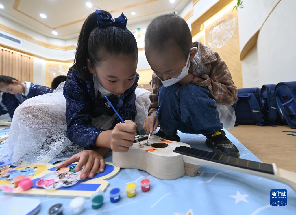 8月29日,在北京市海淀區,羊羊(化名,右)和天使童聲合唱團成員一起繪制尤克里里。