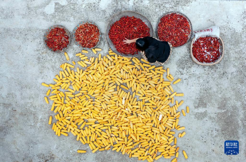 9月5日, 村民在貴州省黔西市定新彝族苗族鄉新村村晾曬辣椒和玉米(無(wú)人機照片)。