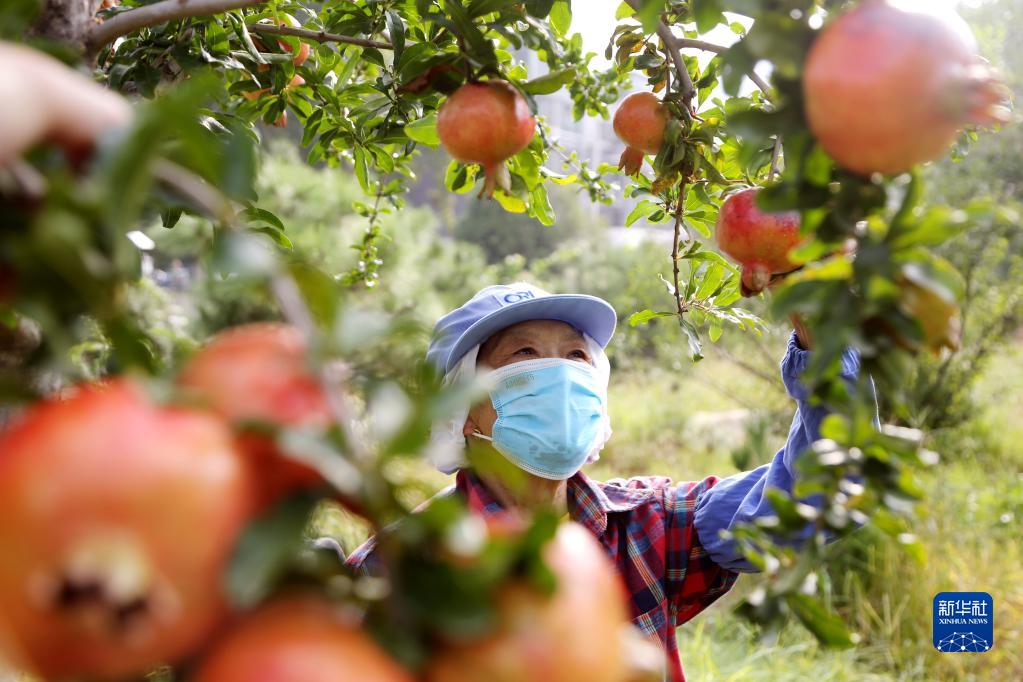 9月5日,在江蘇省連云港市朝陽(yáng)街道韓李村,農民在田園中采摘石榴。