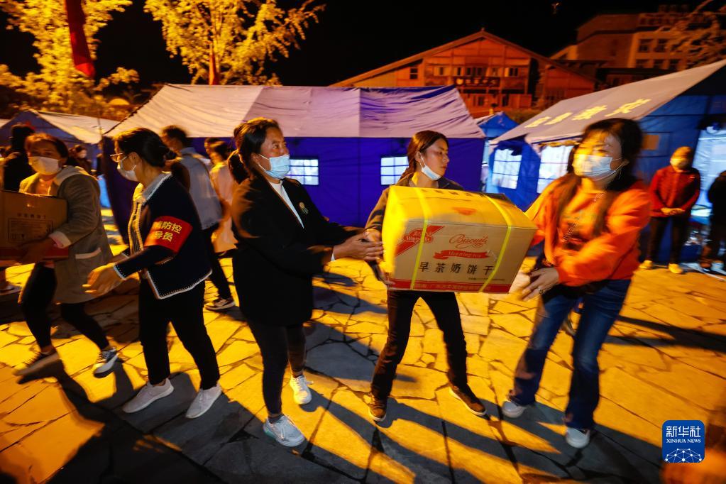 9月5日晚,在四川甘孜州瀘定縣磨西鎮的受災群眾臨時(shí)安置點(diǎn),人們在傳遞救災物資。