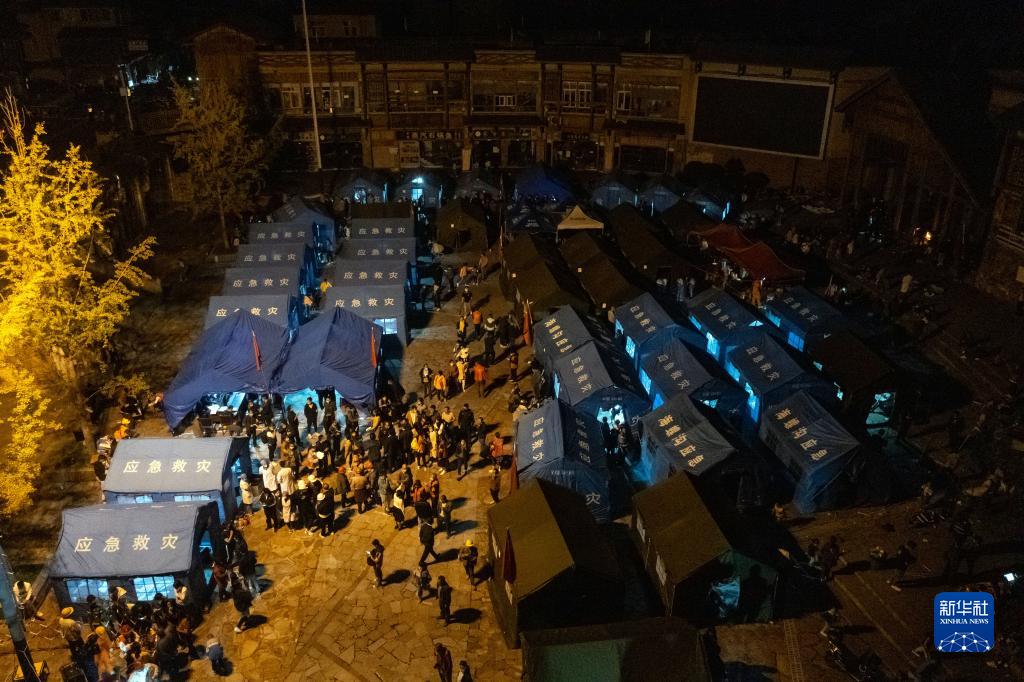 9月5日晚在四川甘孜州瀘定縣磨西鎮拍攝的受災群眾臨時(shí)安置點(diǎn)(無(wú)人機照片)。