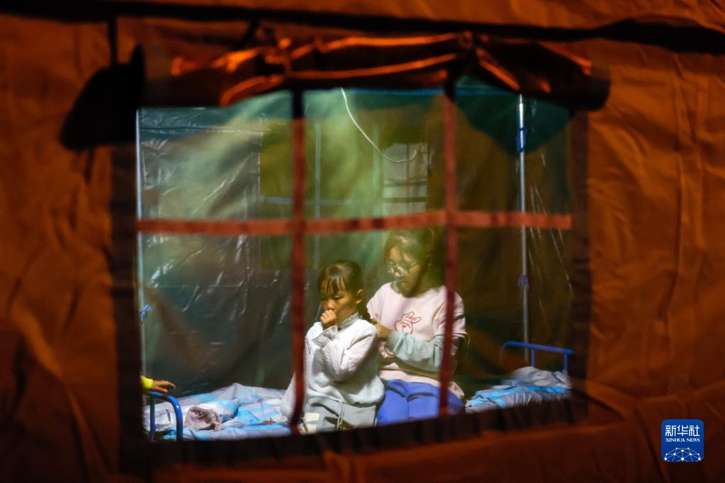 9月5日晚,在四川甘孜州瀘定縣磨西鎮受災群眾臨時(shí)安置點(diǎn),兩名小女孩在帳篷里。