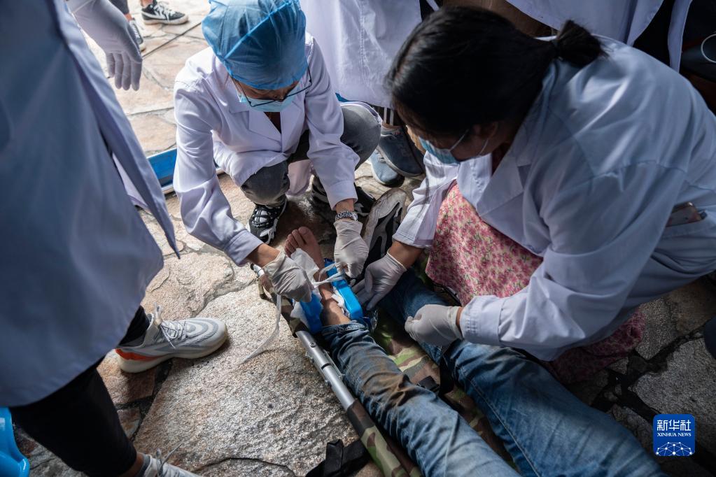 9月6日,在四川甘孜州瀘定縣磨西鎮海螺溝廣場(chǎng)受災群眾臨時(shí)安置點(diǎn),醫護人員為傷員包扎。