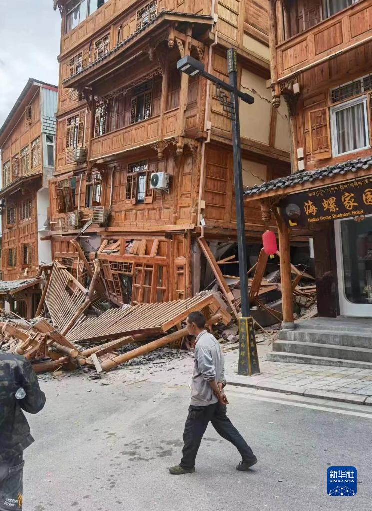 這是9月5日拍攝的四川甘孜州瀘定縣磨西鎮震后房屋受損情況。