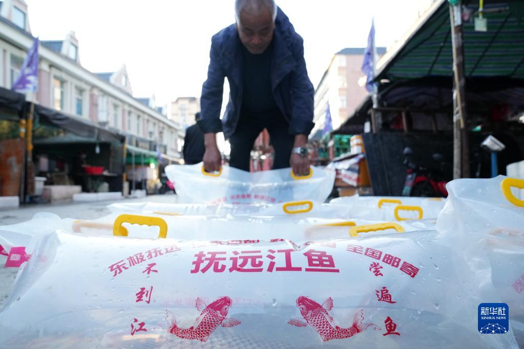 9月4日,在撫遠市東極魚(yú)市,魚(yú)商將活魚(yú)打包準備郵寄。