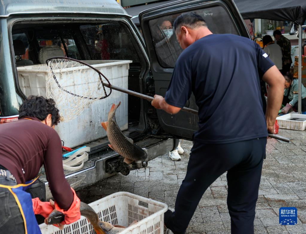 9月4日,在撫遠市東極魚(yú)市,一名魚(yú)商將剛捕撈的活魚(yú)裝進(jìn)魚(yú)箱。