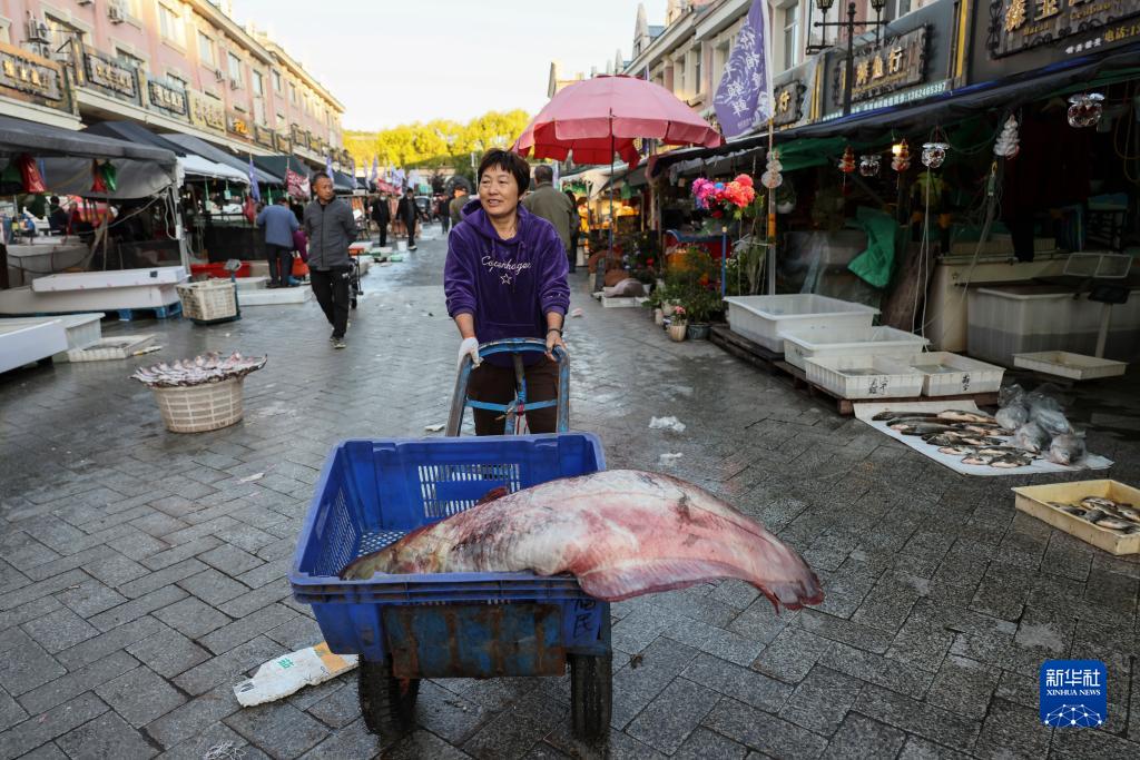 9月4日,在撫遠市東極魚(yú)市,一名魚(yú)商用推車(chē)運魚(yú)。