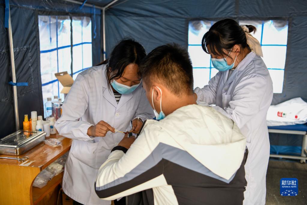 9月6日,在位于石棉縣王崗坪鄉挖角村村委會(huì )的安置點(diǎn),醫療人員為受傷村民清理傷口。