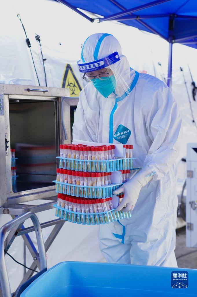 9月5日,氣膜方艙實(shí)驗室的核酸檢測隊工作人員對已檢測標本進(jìn)行轉運處理。