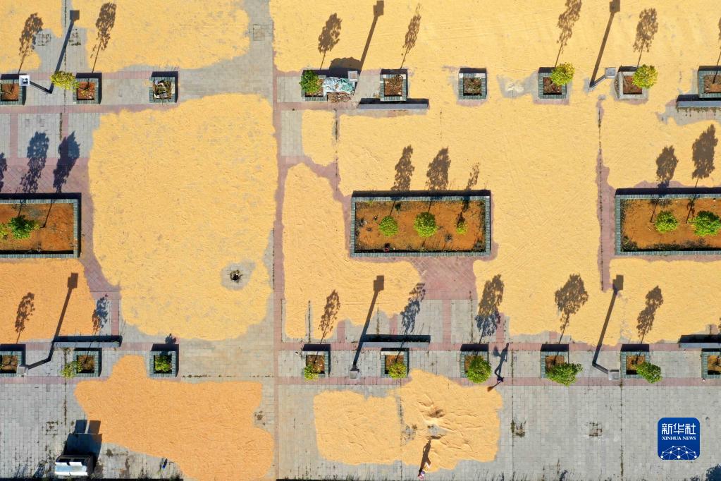 9月6日,村民在貴州省黔南布依族苗族自治州福泉市陸坪鎮羅坳村晾曬谷物(無(wú)人機照片)。