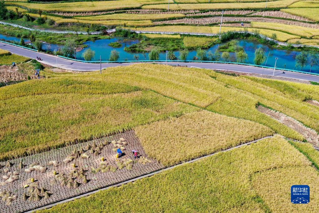 9月6日,貴州省銅仁市玉屏侗族自治縣朱家場(chǎng)鎮混寨村的村民在收獲稻谷(無(wú)人機照片)。