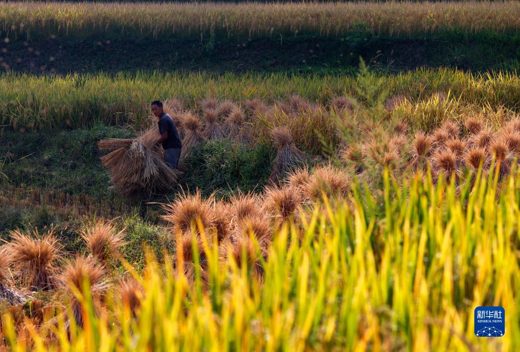 9月6日,村民在貴州省遵義市正安縣鳳儀街道田生社區田間收稻草。