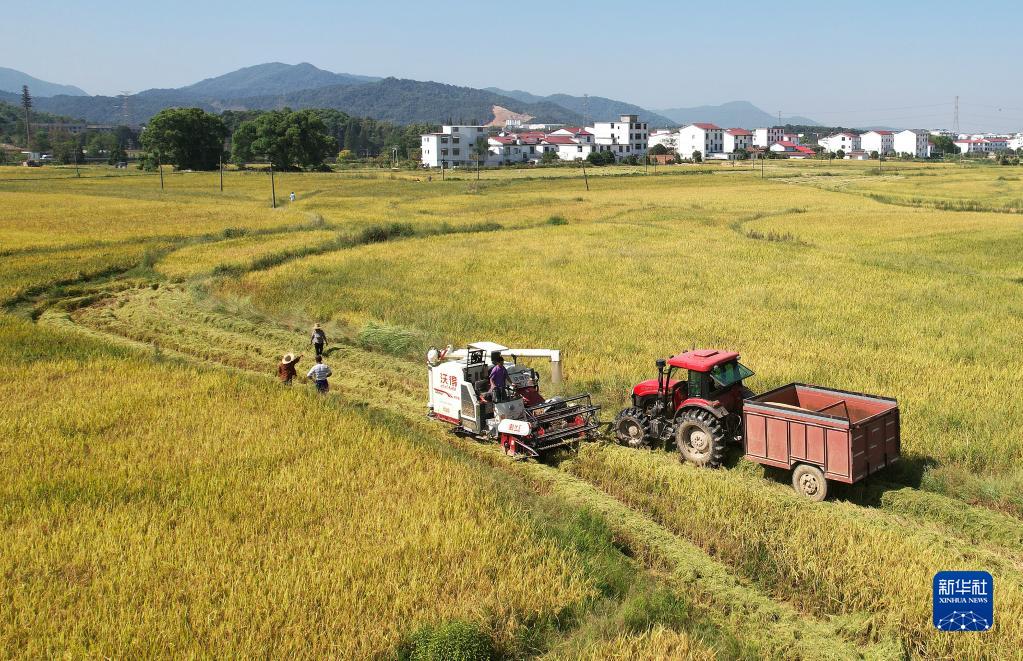9月6日,江西省南昌市灣里管理局羅亭鎮的農戶(hù)在收割中稻(無(wú)人機照片)。