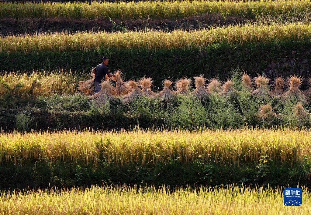 9月6日,村民在貴州省遵義市正安縣鳳儀街道田生社區田間收稻草。