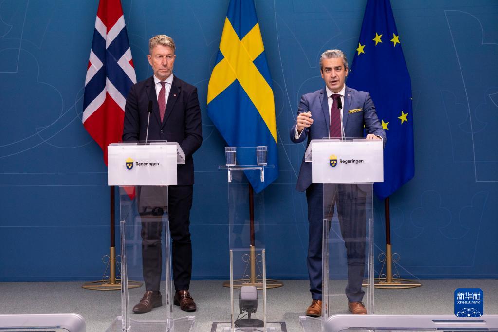 9月5日,在瑞典斯德哥爾摩,瑞典能源與數字化發(fā)展大臣哈沙亞爾·法爾曼巴(右)與挪威石油和能源大臣泰耶·奧斯蘭共同出席新聞發(fā)布會(huì )。