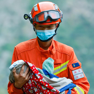 9月6日,阿壩森林消防支隊汶川大隊隊員張自立抱著(zhù)一名從瀘定縣得妥鎮灣東村疏散出來(lái)的2個(gè)月大的嬰兒。