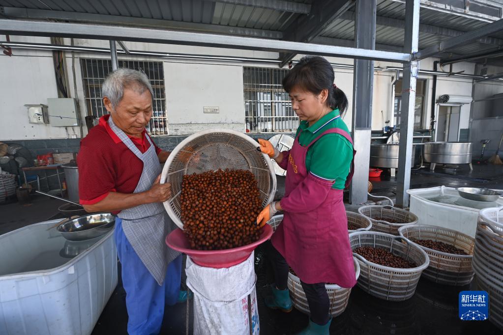 9月7日,在淳安縣臨岐鎮的山核桃“共富工坊”加工企業(yè)內,當地村民在加工剛采收的山核桃。
