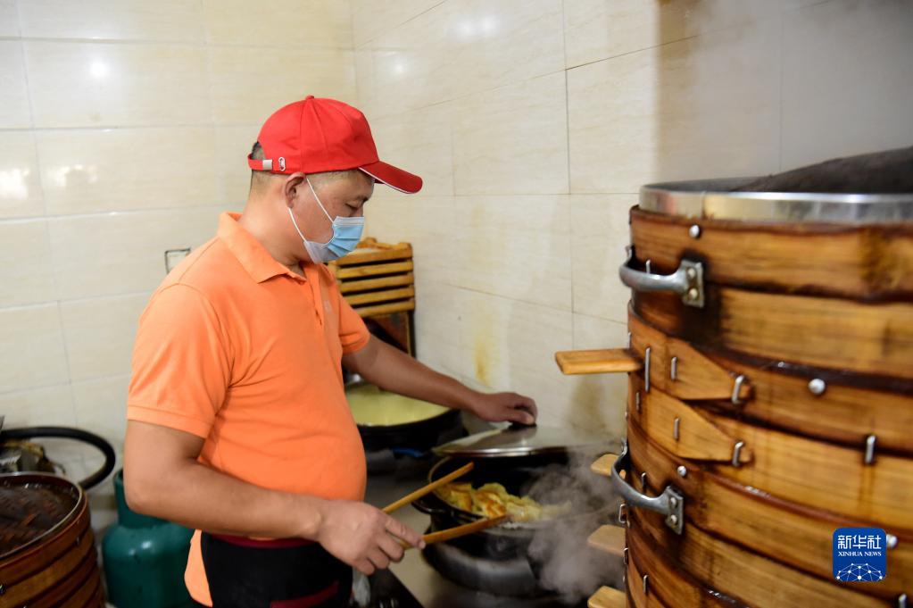 9月6日,孫玉喜在早餐店內制作煎餃。