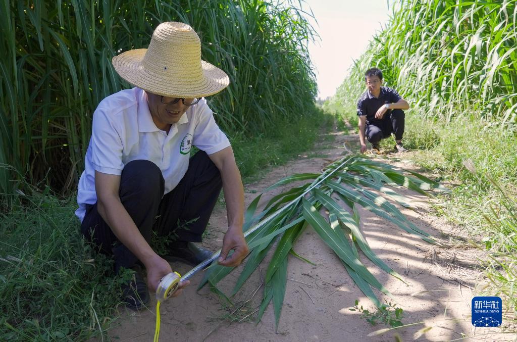 9月6日,在寧夏靈武市郝家橋鎮團結村,技術(shù)人員(左)在測量巨菌草的生長(cháng)數據。
