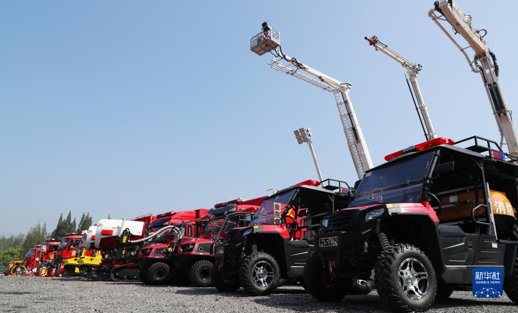 9月7日,參加演練的消防救援車(chē)輛在現場(chǎng)集結。