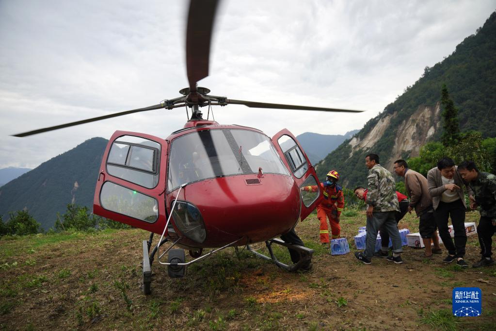 9月7日,在雅安市石棉縣王崗坪彝族藏族鄉幸福村二組,村民與消防救援隊員搬運直升機送來(lái)的水和食物。