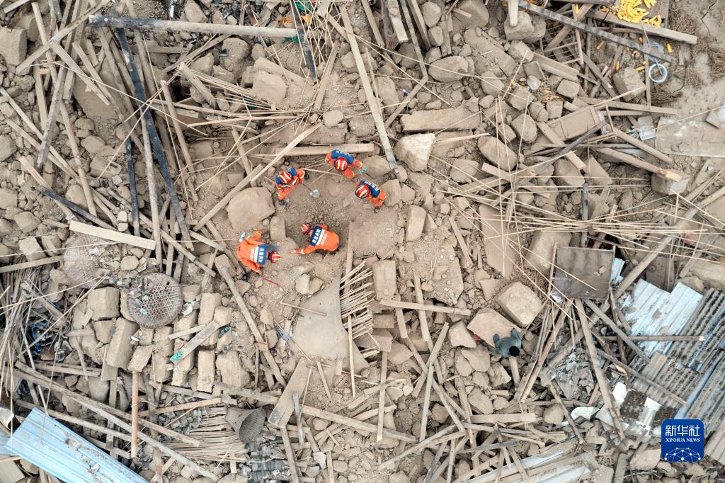9月7日,在雅安市石棉縣王崗坪彝族藏族鄉幸福村二組,四川眉山消防救援隊隊員幫助村民在倒塌的房屋中找尋物品(無(wú)人機照片)。